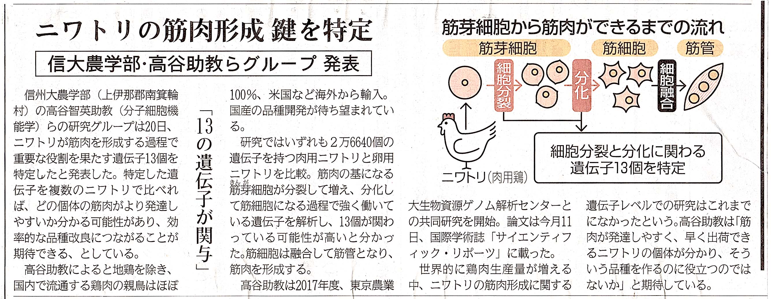 ニワトリの筋肉形成 鍵を特定 信大農学部・高谷助教らのグループ発表. 信濃毎日新聞, 2019/11/21.