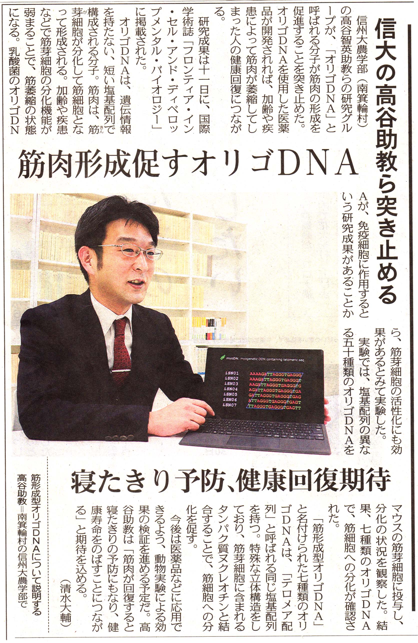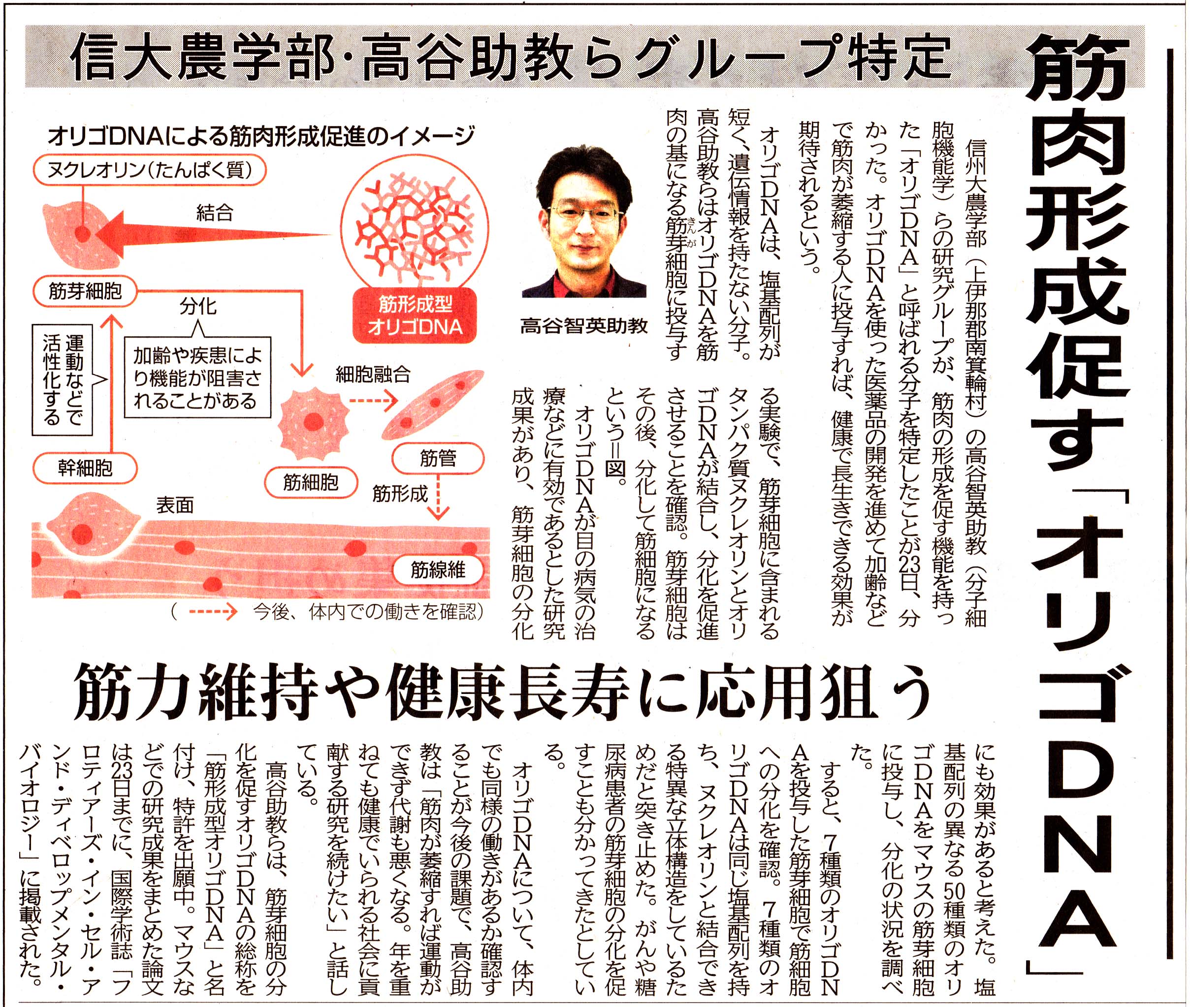筋肉形成促すオリゴ DNA 信大の高谷助教ら突き止める. 中日新聞, 2021/01/27.