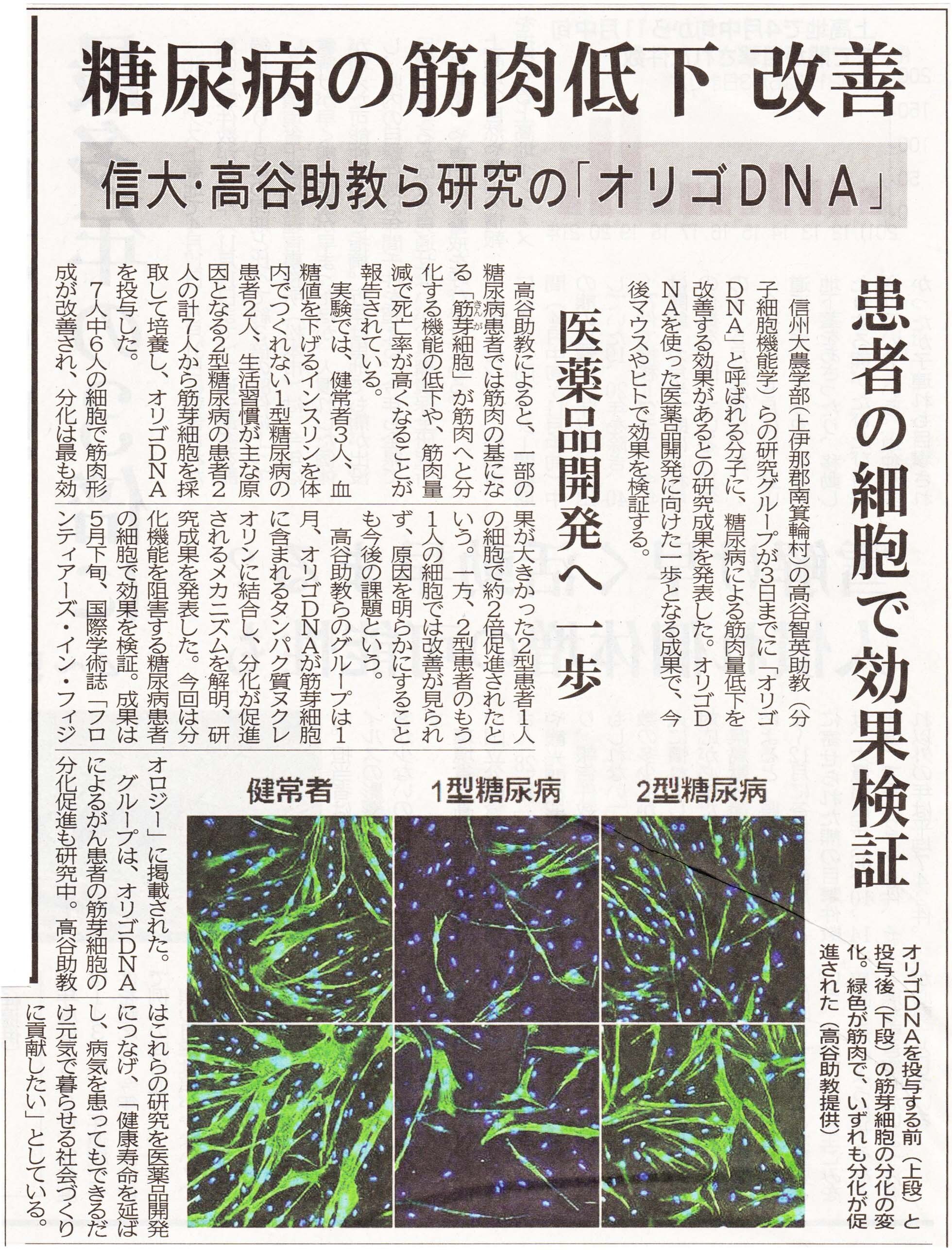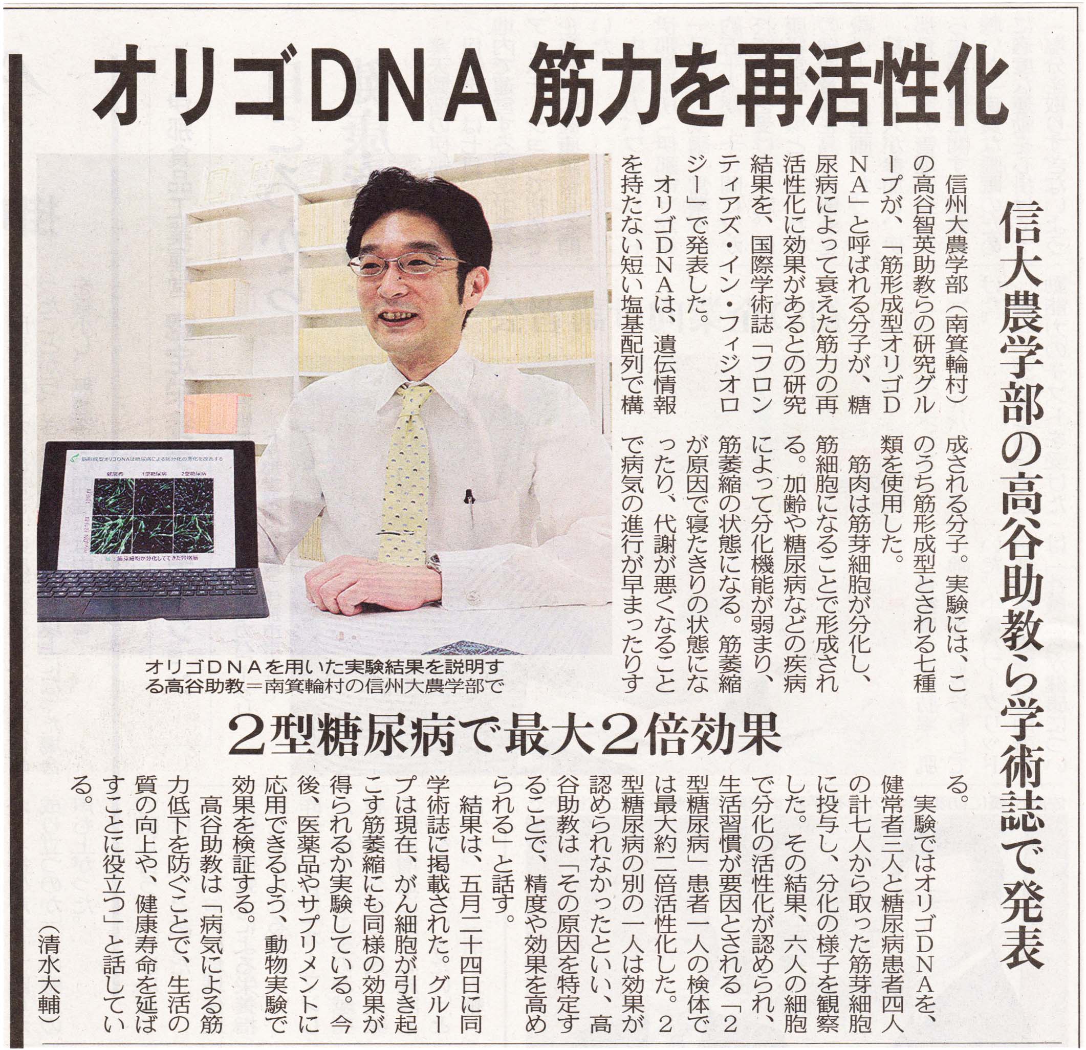 糖尿病の筋肉低下 改善 信大・高谷助教ら研究の「オリゴ DNA」. 信濃毎日新聞, 2021/06/04.