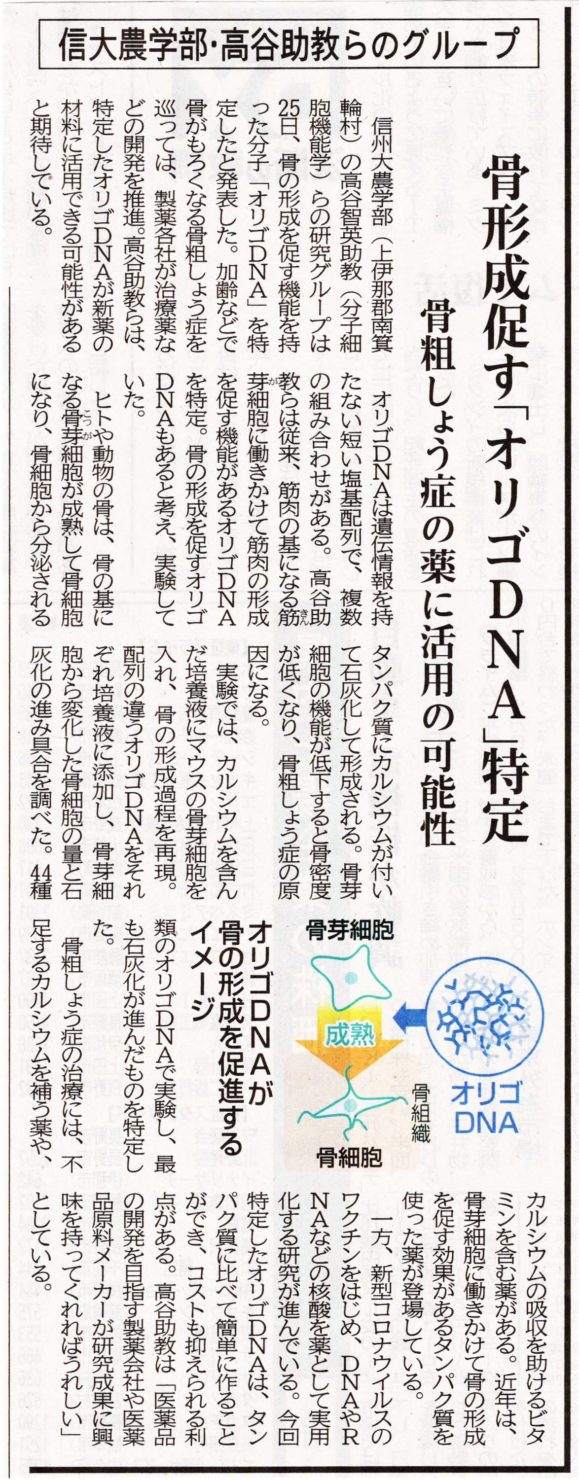 骨の形成を促す「オリゴ DNA」を特定 信州大農学部・高谷助教らのグループ. 信濃毎日新聞, 2022/05/26.