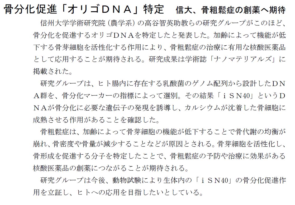 骨分化促進「オリゴ DNA」特定 信大、骨粗鬆症の創薬へ期待. 医療タイムス 長野県版, 2022/05/27.