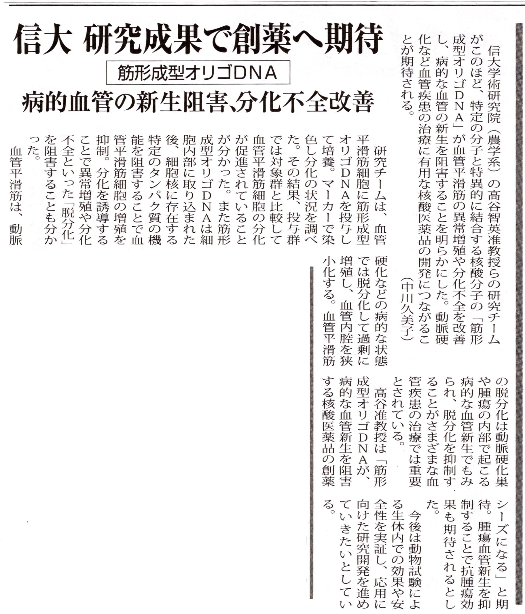 「オリゴ DNA」に血管形成阻害効果 がん治療に活用可能性. 信濃毎日新聞, 2024/07/02.